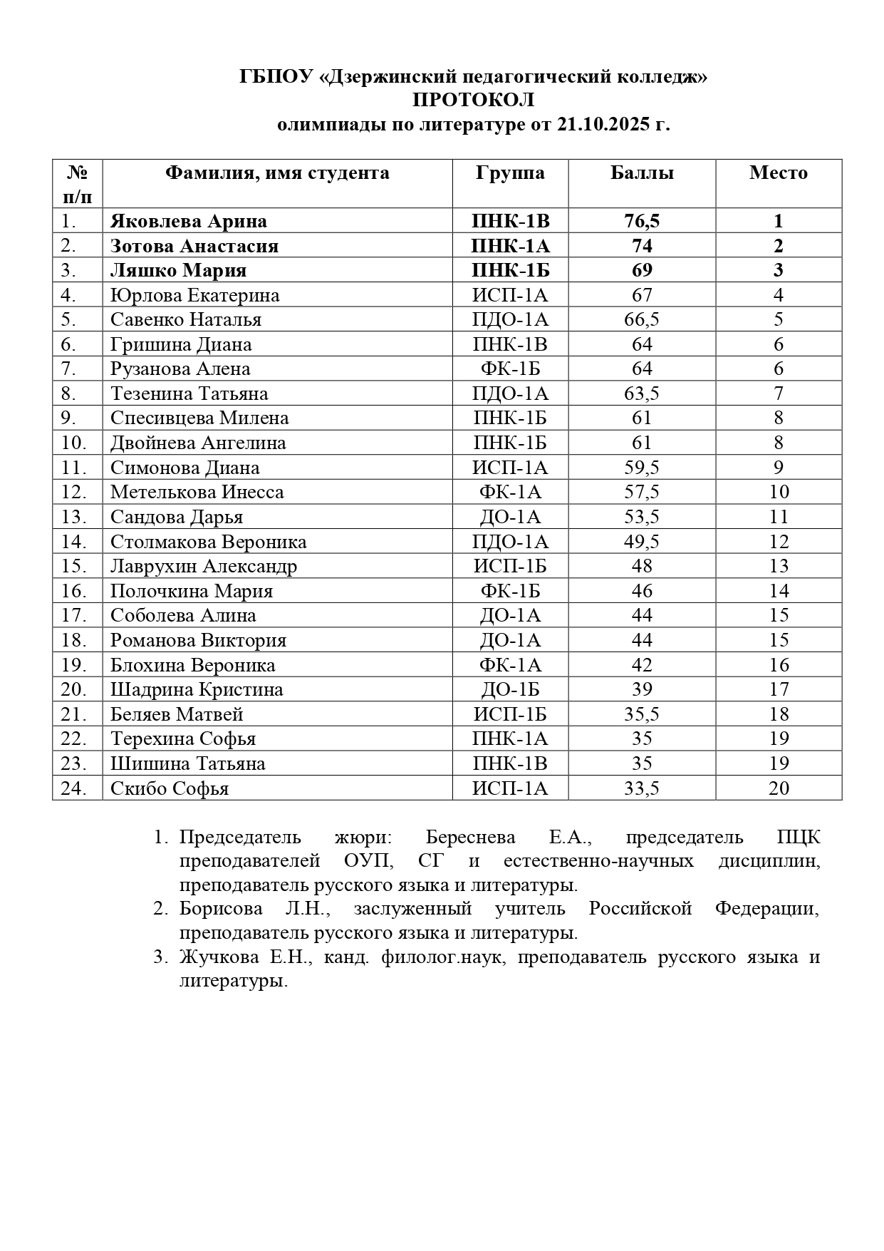 21 октября 2025 г. в колледже состоялась олимпиада по литературе в рамках декады ПЦК преподавателей ОУП, СГ и естественно-научных дисциплин. В ней приняли участие 24 студента первого курса. Результаты олимпиады таковы: