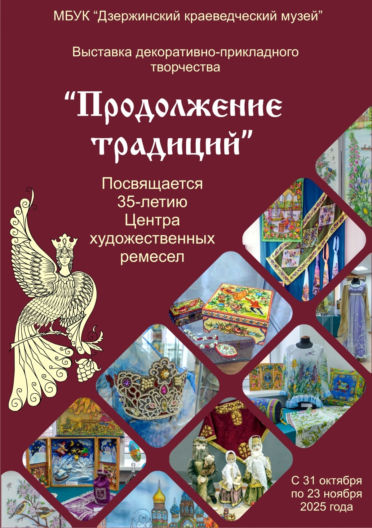 С 1 по 23 ноября 2025 года в МБУК «Дзержинский краеведческий музей» будет работать выставка «Продолжение традиций», посвященная одному из древних ремесел – декоративно-прикладному творчеству.