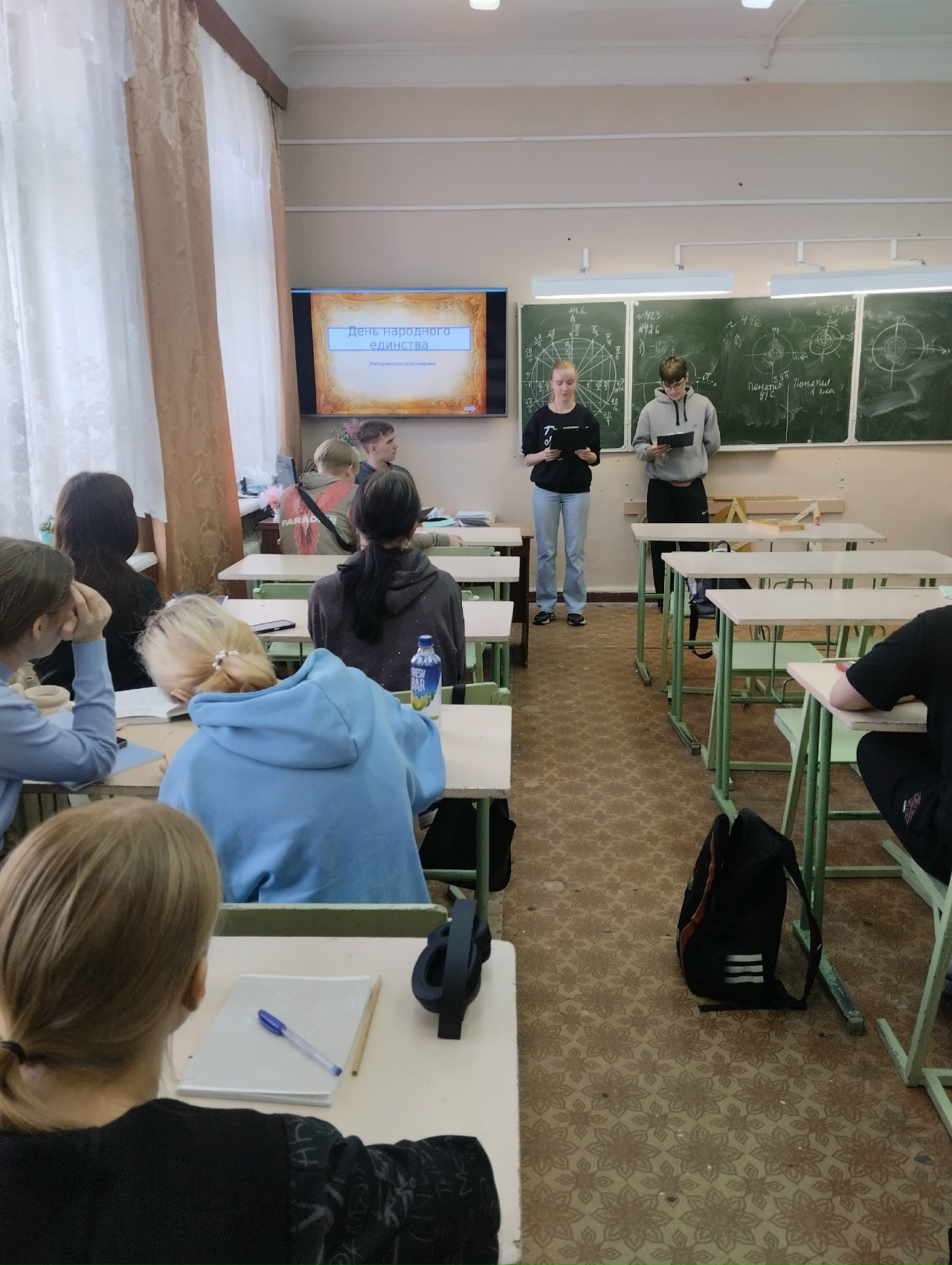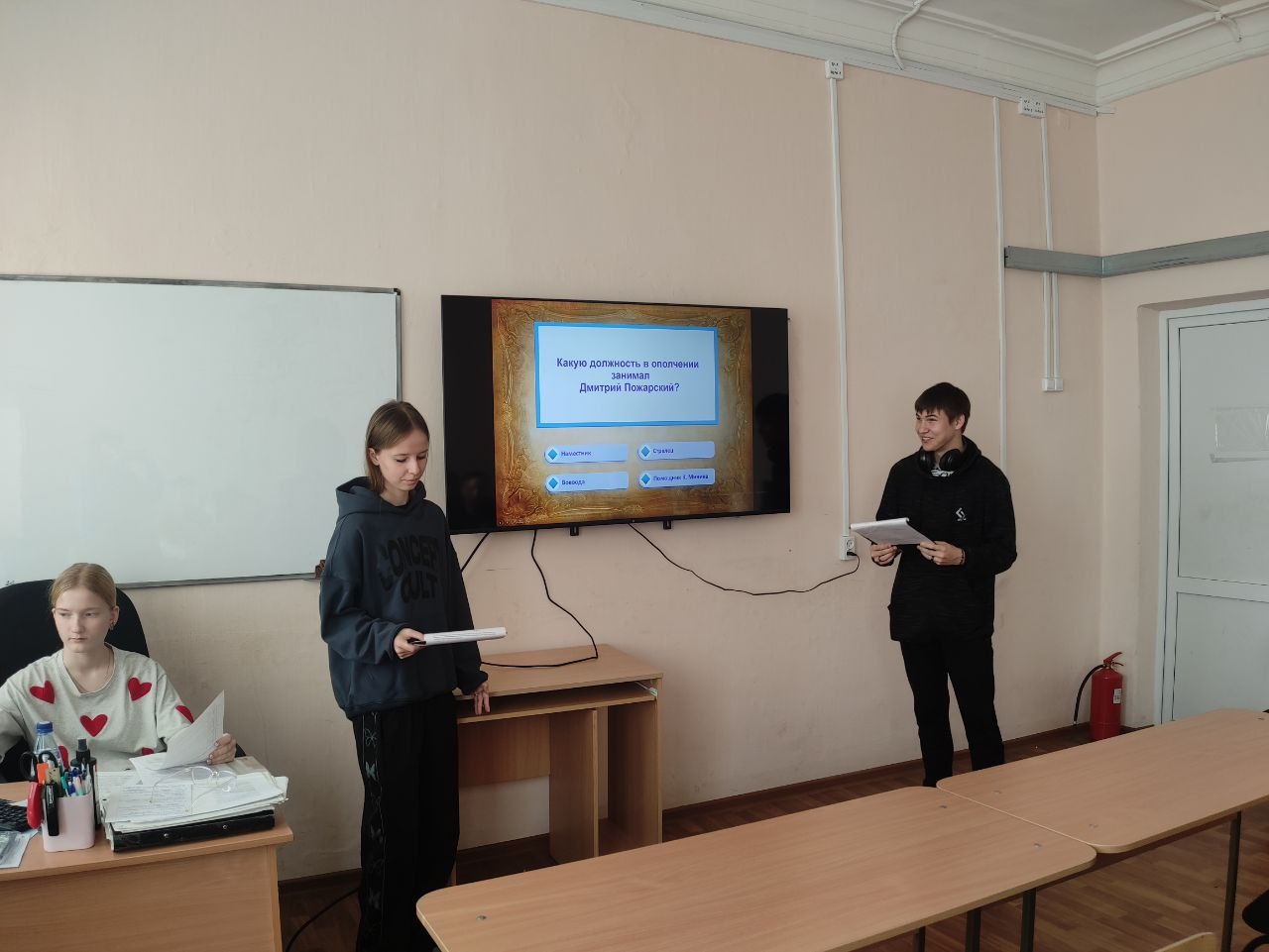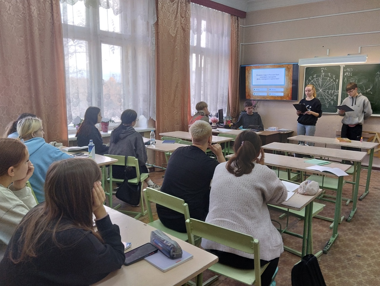 Ребятам были заданы вопросы про участников ополчения, даты основных событий, а также литературные произведения, в которых описывается борьба с польско-литовскими интервентами. Студенты очень активно участвовали и показали хорошие знания истории этого знаменательного дня.