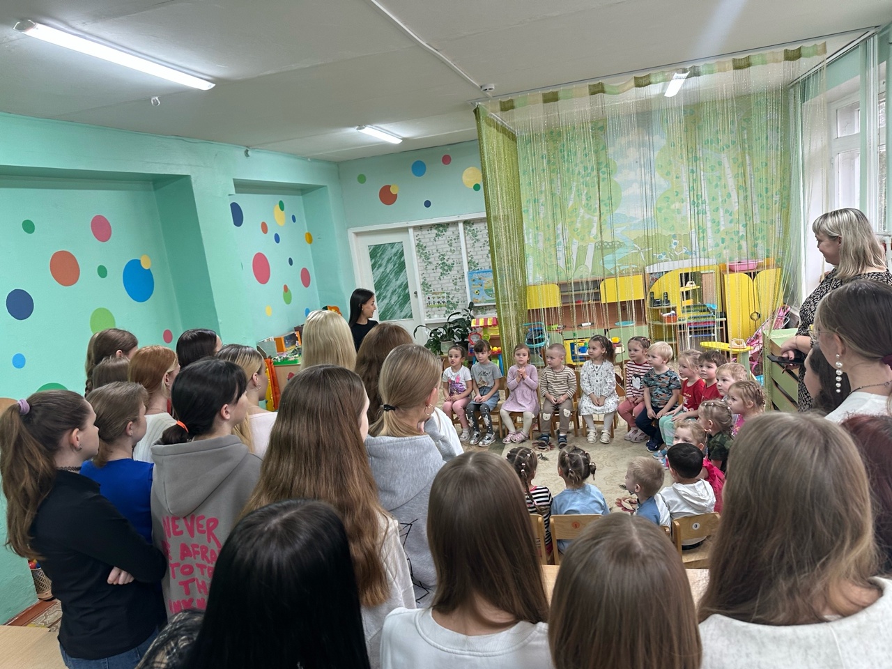 Ребятам показали групповые помещения, музыкальный и спортивный залы, кабинеты специалистов. Студенты с большим интересом наблюдали за занятиями и общением педагогов с воспитанниками.