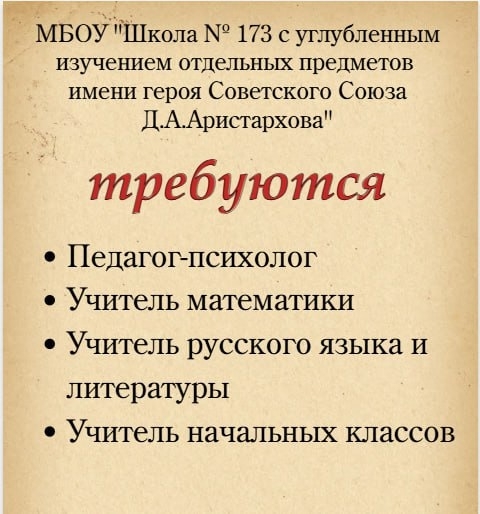 В нашем дружном коллективе МБОУ «Школа № 173 с углублённым изучением отдельных предметов имени героя Советского Союза Д. А. Аристархова» открыты вакансии для преподавателей.