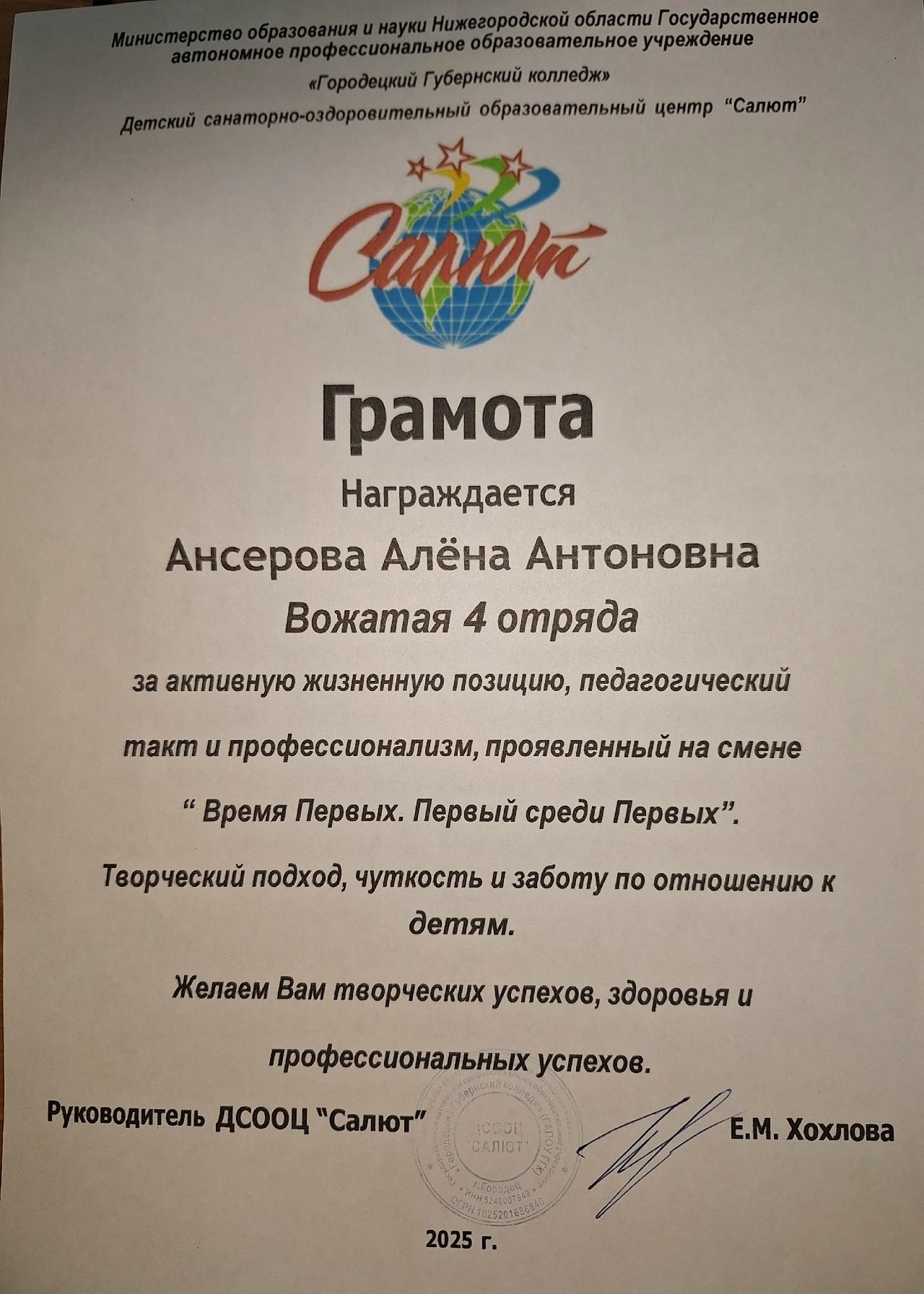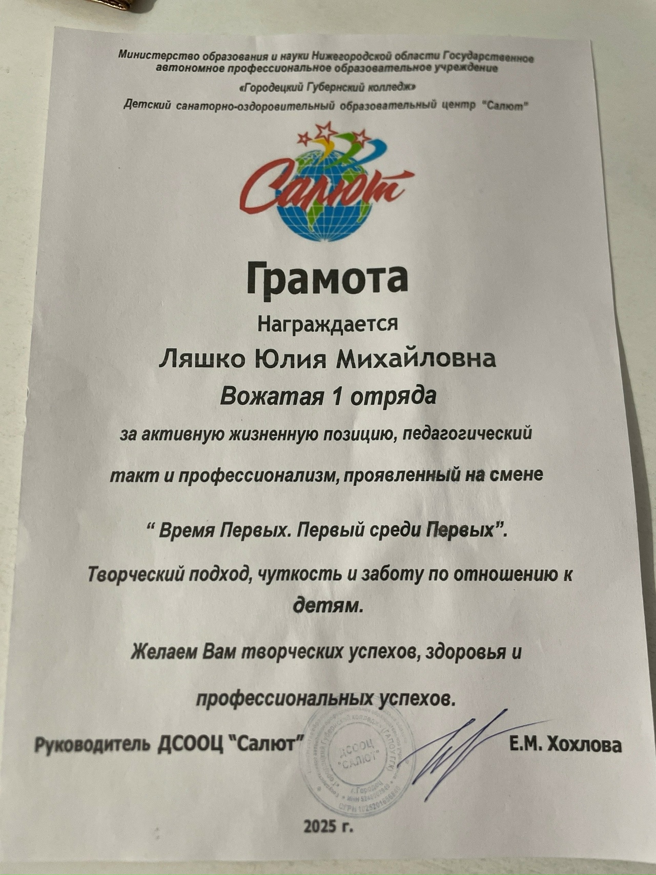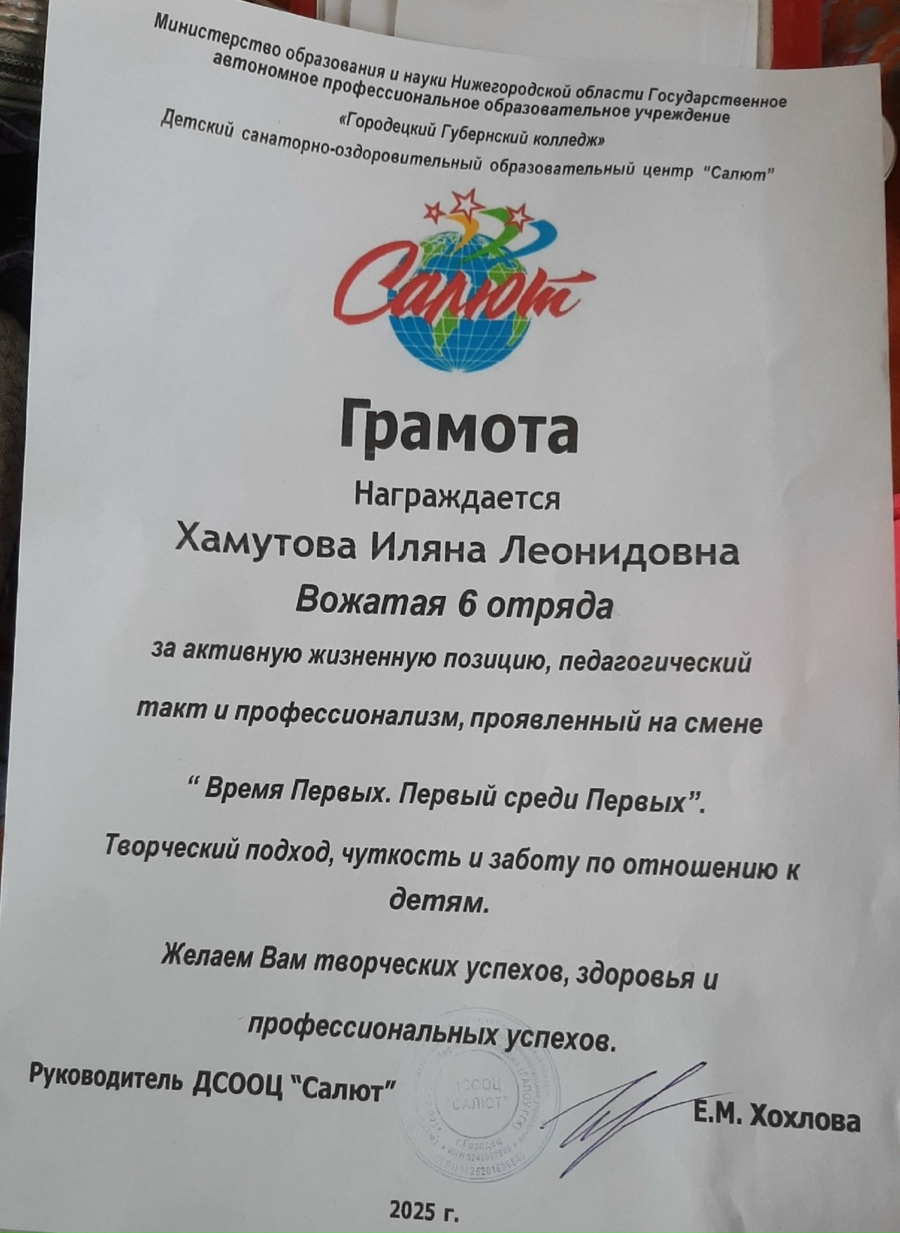 5 декабря студентки специальности “Педагогика дополнительного образования” Ляшко Юлия (ПДО-3А), Хамутова Иляна (ПДО-3А) и Ансерова Алена (ПДО-2А) вернулись со смены в ДСООЦ «Салют» | Лагерь Городец. Вернулись девушки не с пустыми руками, а с грамотами и благодарственными письмами за отличную работу. Судя по фото, атмосфера в лагере была волшебная, а наши студентки прошли интенсив и по вожатской деятельности, и по организации воспитательных и досуговых мероприятий. Девчата, поделитесь впечатлениями о том, как прошла смена в комментариях к этому посту.