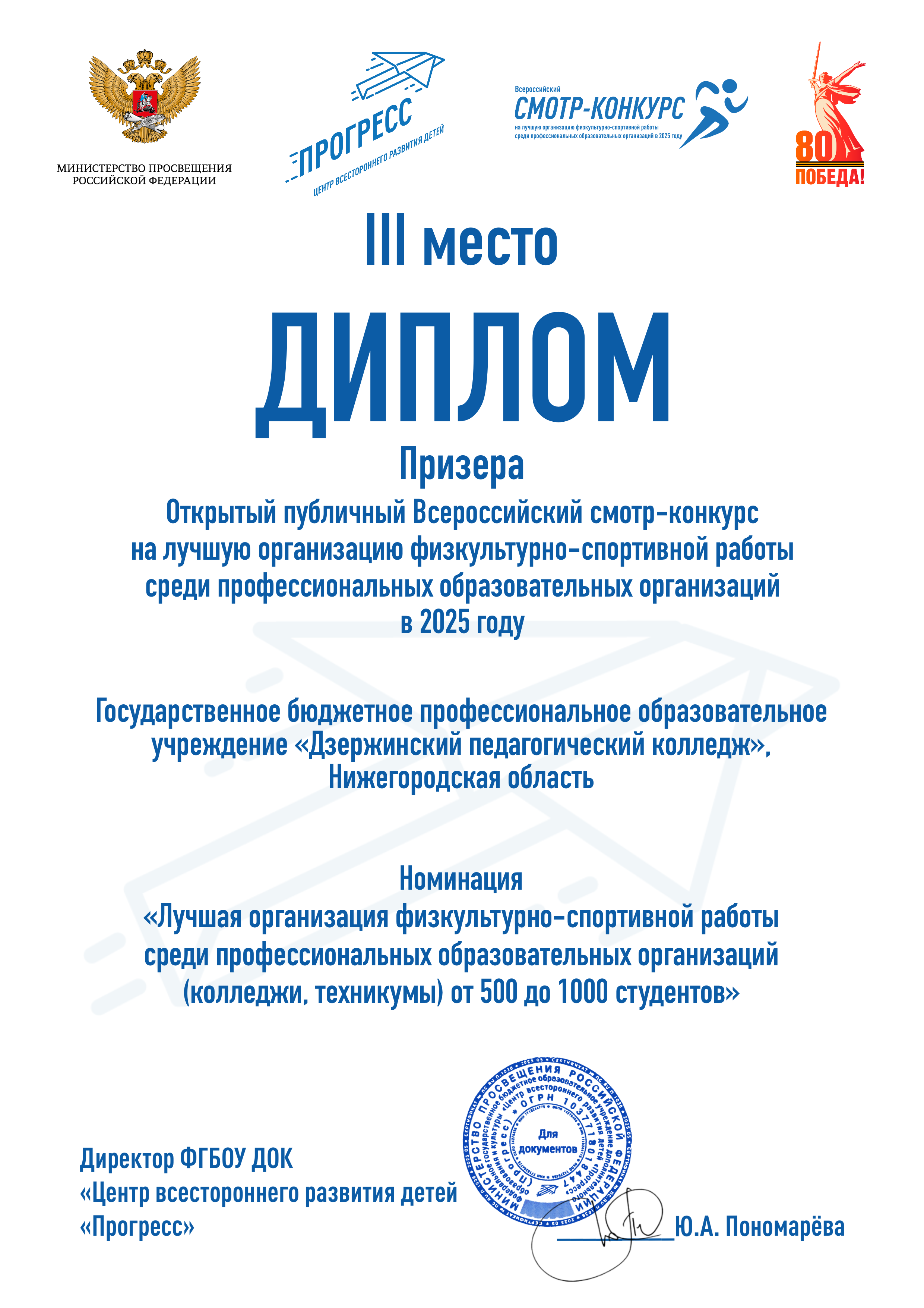 Диплом Открытого публичного Всероссийского смотр-конкурса за лучшую организацию физкультурно-спортивной работы среди профессиональных образовательных организаций в 2025 году