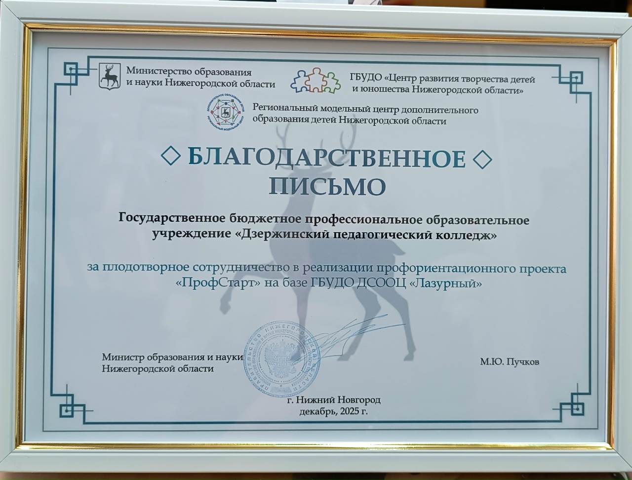 Благодарственное письмо за реализацию профориентационного проекта “ПрофСтарт” на базе ГБУДО ДСООЦ “Лазурный”