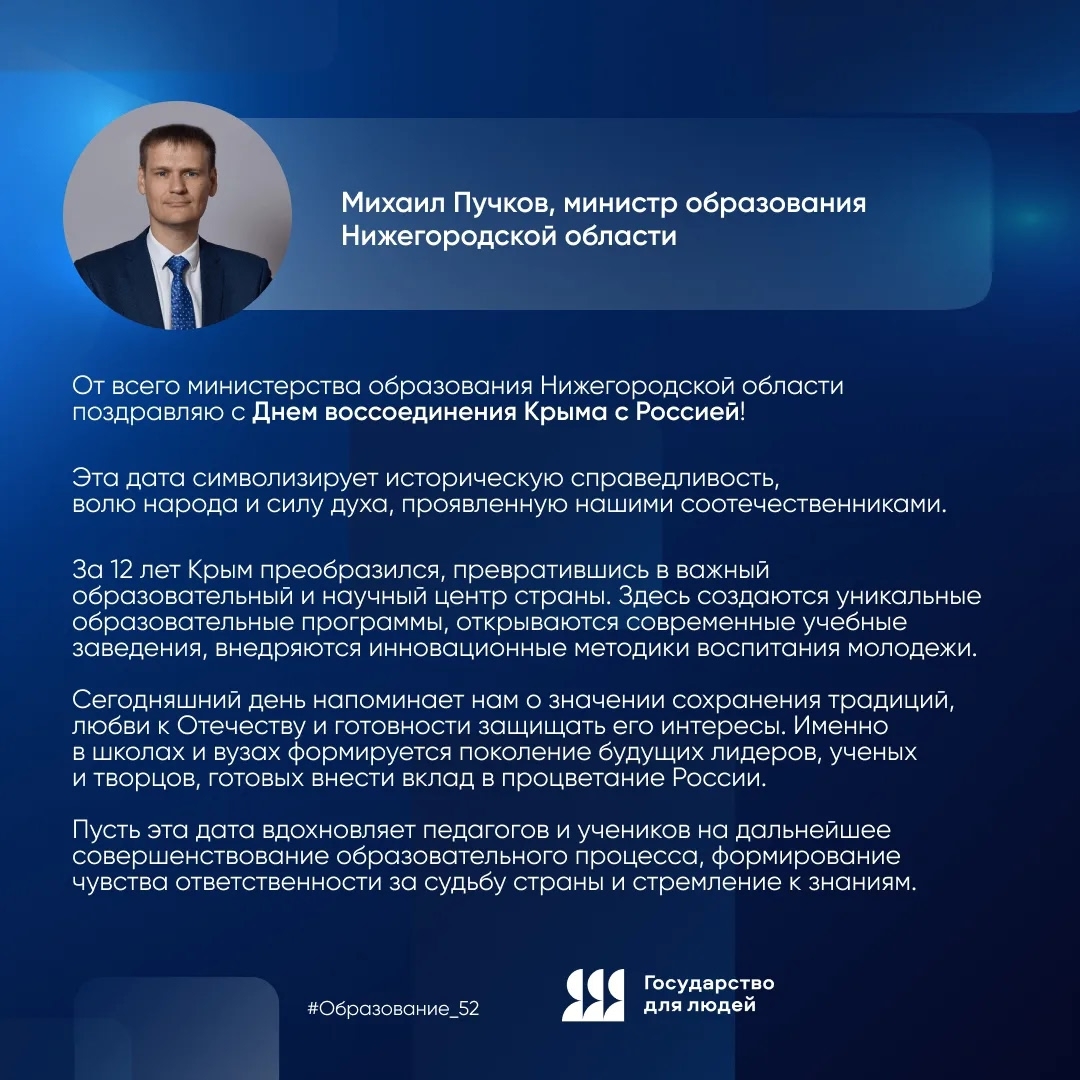 Поздравление министра образования Нижегородской области М.Ю. Пучкова с Днем воссоединения Крыма с Россией