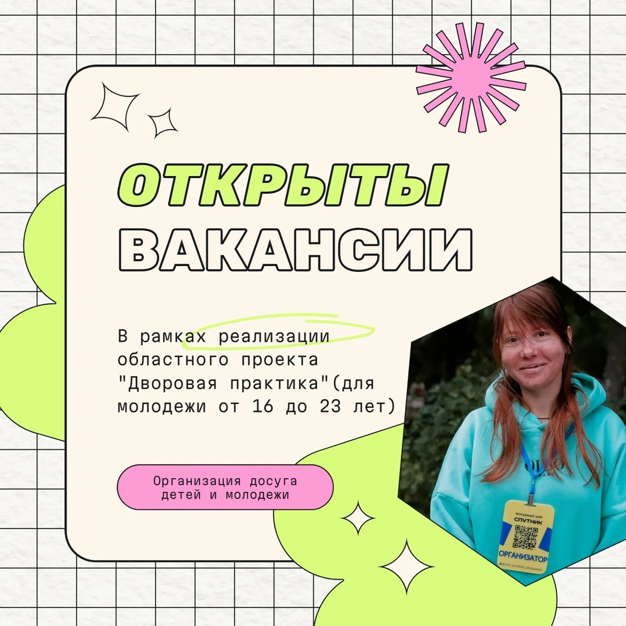 🤩В рамках реализации областного проекта “Дворовая практика” (для молодежи от 16 до 23 лет) мы ищем двух ответственных специалистов!
