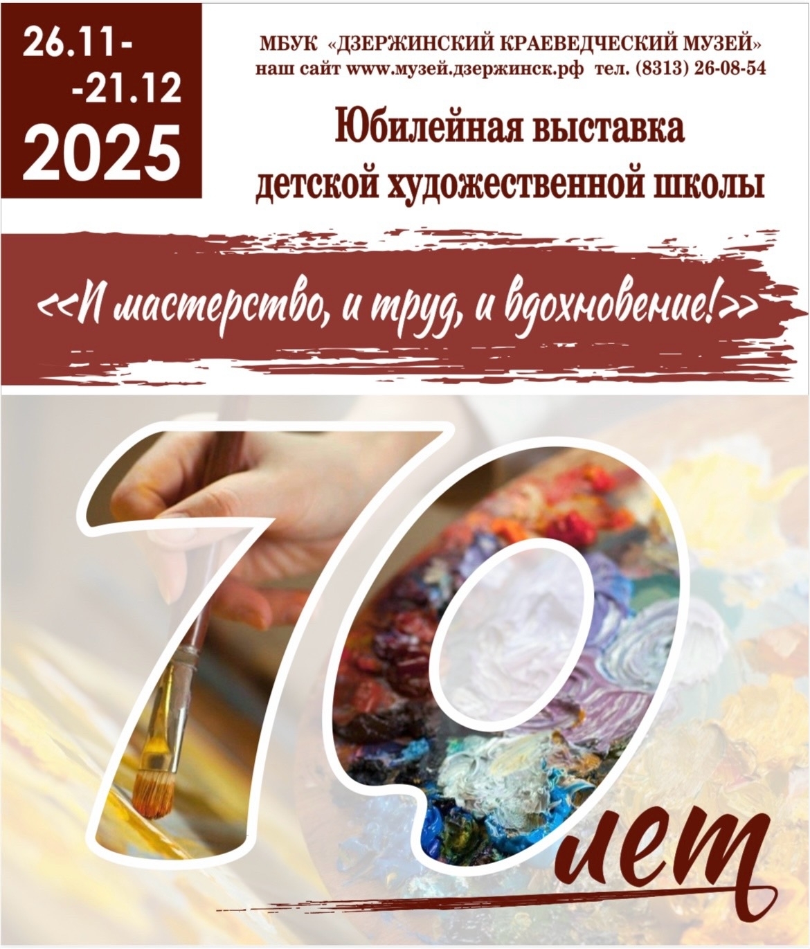 С 27 ноября по 21 декабря в МБУК «Дзержинский краеведческий музей» будет работать выставка «И мастерство, и труд, и вдохновение», приуроченная к 70-летнему юбилею МБУ ДО «Детская художественная школа».