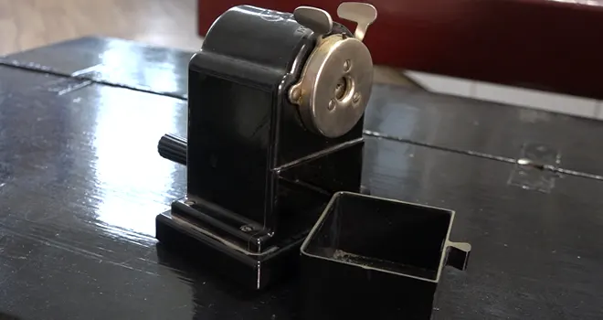 А сейчас снова ненадолго вернемся в школу. В нашей традиционной рубрике речь пойдет об очень любопытном экспонате — немецкой точилке, которая, конечно же, совершенно не похожа на современные.