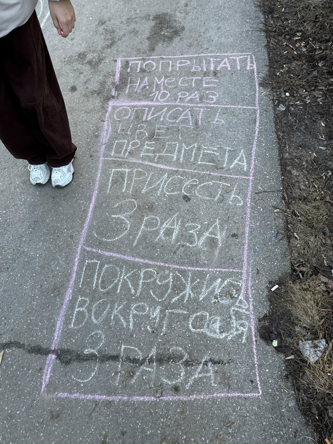 · Кто ошибся — отходит на штрафной квадрат, из которого можно «выкупить» себя, выполнив задание (присесть 3 раза или назвать цвет предметов вокруг).