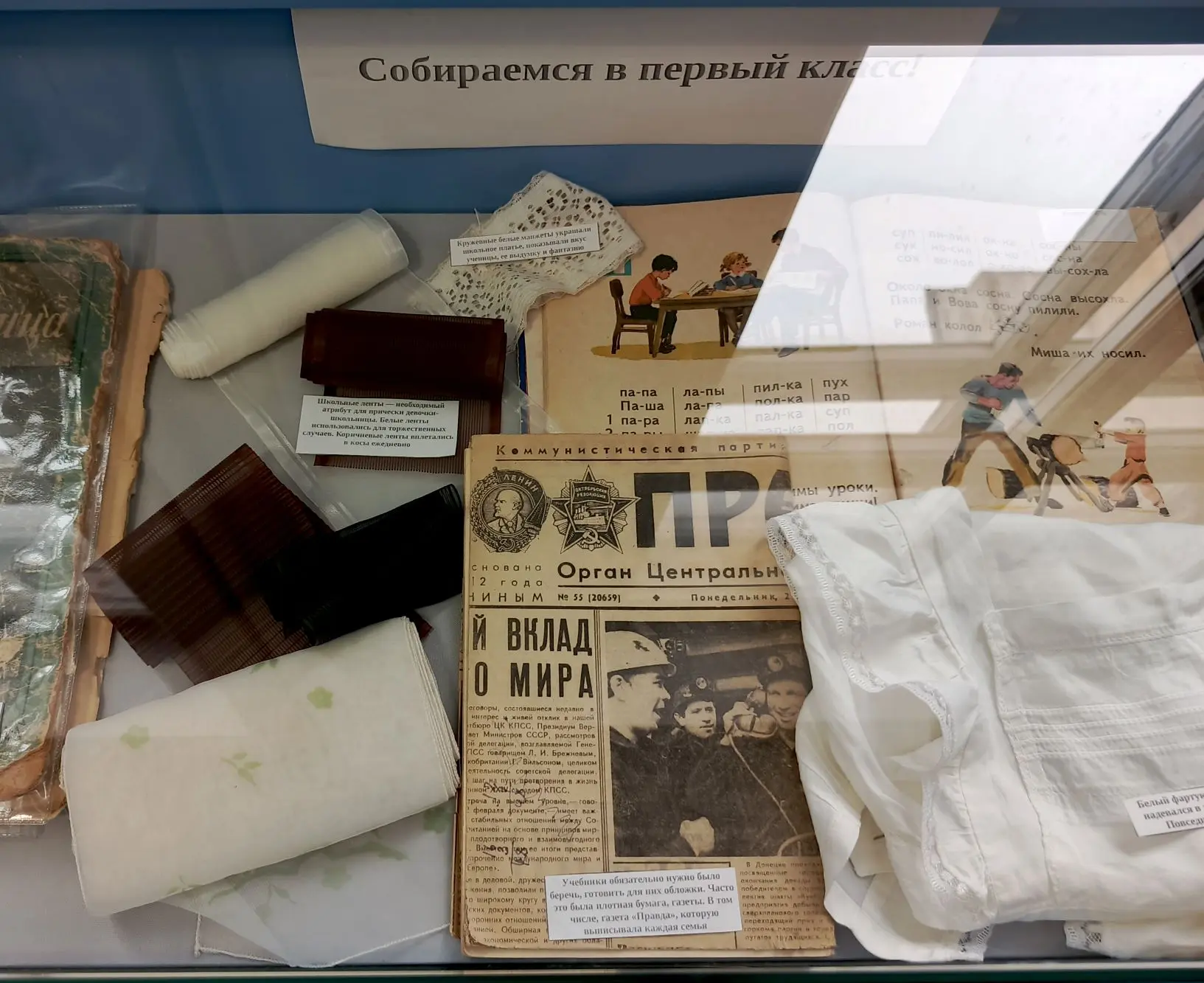 Есть в музее и тематические выставочные витрины. Мы расскажем и покажем про раздельное и совместное обучение мальчиков и девочек, про систему подготовки к обучению в начальной школе, про эволюцию школьной формы, учебных принадлежностей, покажем коллекцию значков и эмблем.